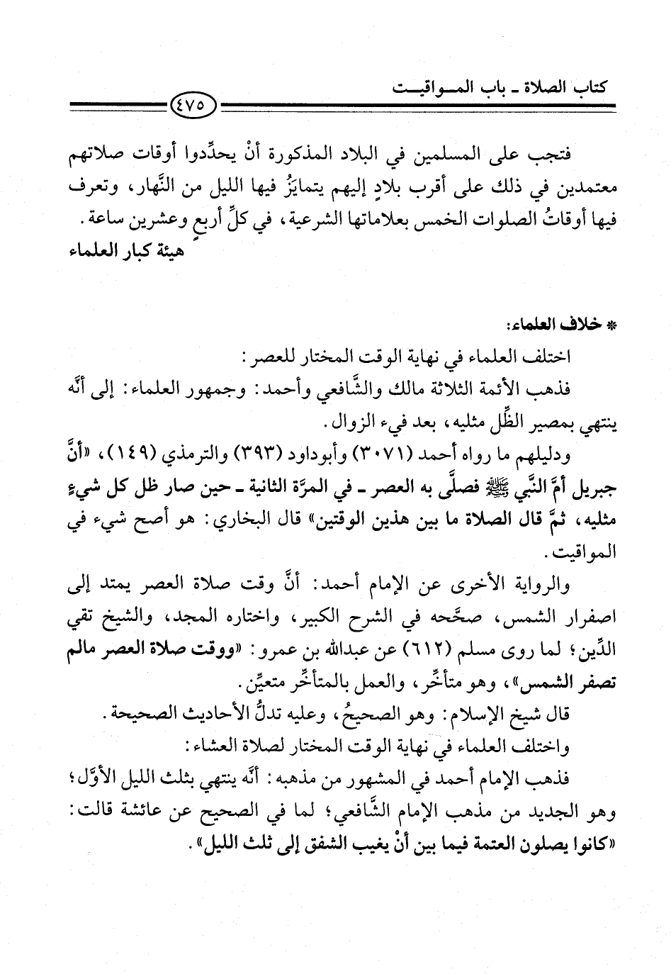 قال شيخ الإسلام: وهو الصحيحُ، وعليه تدلُّ الأحاديث الصحيحة. واختلف العلماء في نهاية الوقت المختار لصلاة العشاء: