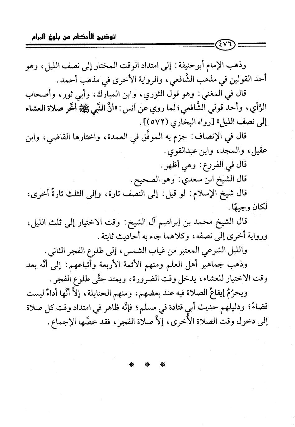 قال في المغني: وهو قول الثوري، وابن المبارك، وأبي ثور، وأصحاب الرَّأي، واحد قولي الشَّافعي؛ لما روي عن أنس: "أنَّ النَّبي -صلى الله عليه وسلم- أخَّر صلاة العشاء إلى نصف الليل" [رواه البخاري (572)].