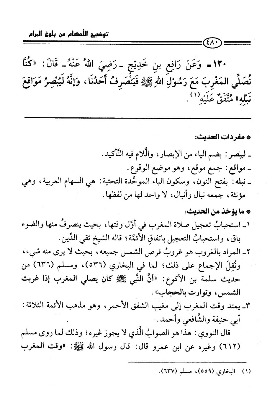 130 - وَعَنْ رَافِعِ بْنِ خَدِيجٍ -رضي الله عنه- قَالَ: "كُنَّا نُصَلِّي الْمَغْرِبَ مَعَ رَسُوْلِ اللَّهِ -صلى الله عليه وسلم- فَيَنْصَرِفُ أَحَدُنَا، وَإِنَّهُ لَيُبْصِرُ مَوَاقِعَ نَبْلِهِ" مُتَّفَقٌ عَلَيْهِ (¬1).