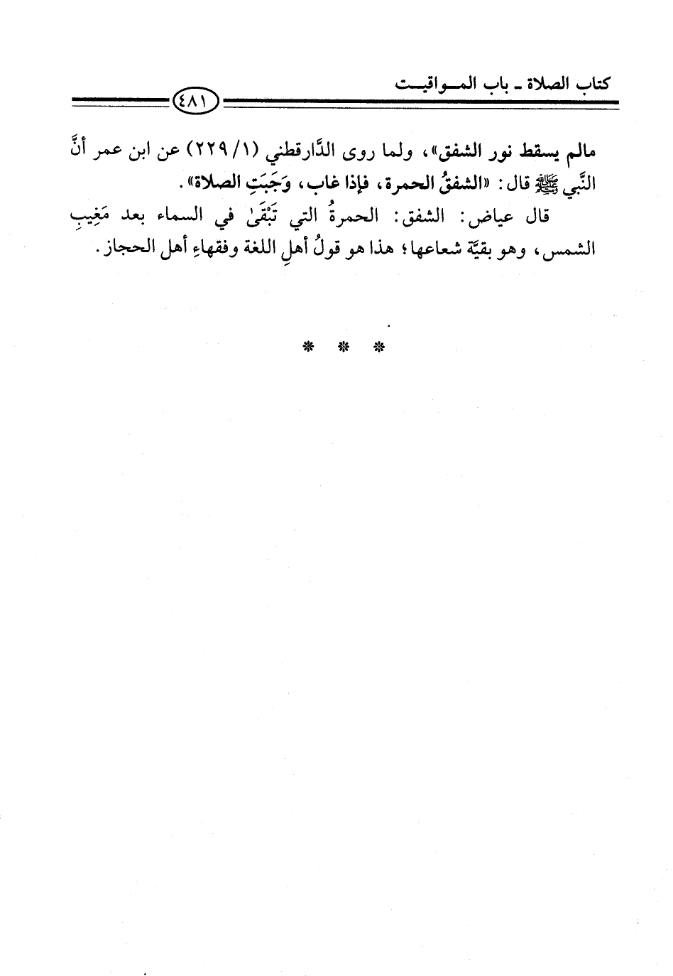 ما لم يسقط نور الشفق"، ولما روى الدَّارقطني (1/ 229) عن ابن عمر أنَّ النَّبي -صلى الله عليه وسلم- قال: "الشفقُ الحمرة، فإذا غاب، وَجَبَتِ الصلاة".