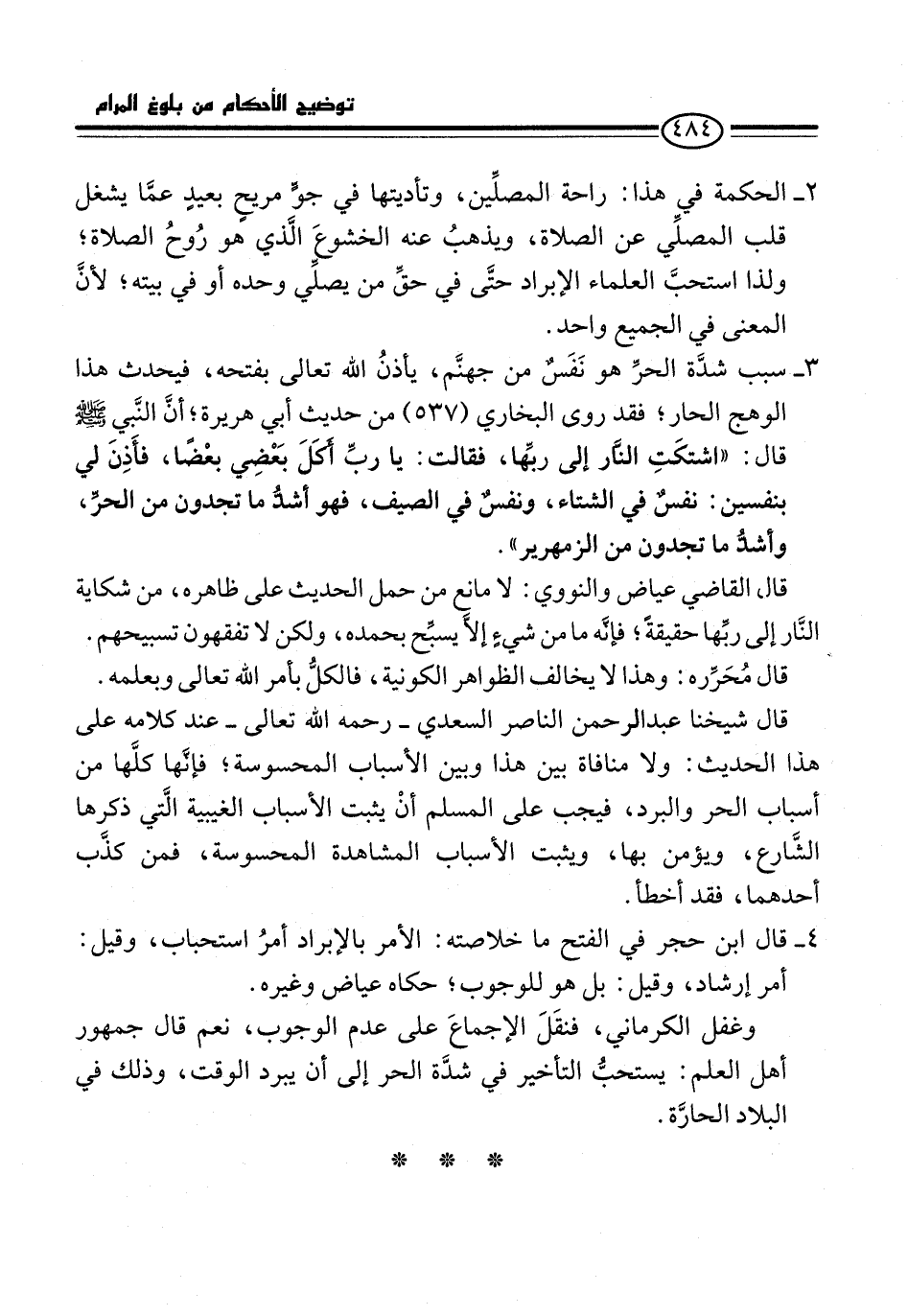 4 - قال ابن حجر في الفتح ما خلاصته: الأمر بالإبراد أمرُ استحباب، وقيل: أمر إرشاد، وقيل: بل هو للوجوب؛ حكاه عياض وغيره.
