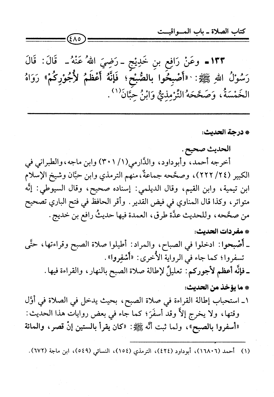 133 - وَعَنْ رَافِعِ بْنِ خَدِيْجٍ -رضي الله عنه- قَالَ: قَالَ رَسُولُ اللَّهِ -صلى الله عليه وسلم-: "أَصْبِحُوا بِالصُّبْحِ؛ فَإِنَّهُ أَعْظَمُ لِأُجُورِكُمْ" رَوَاهُ الْخَمْسَةُ, وَصَحَّحَهُ التِّرْمِذِيُّ وَابْنُ حِبَّانَ (¬1).