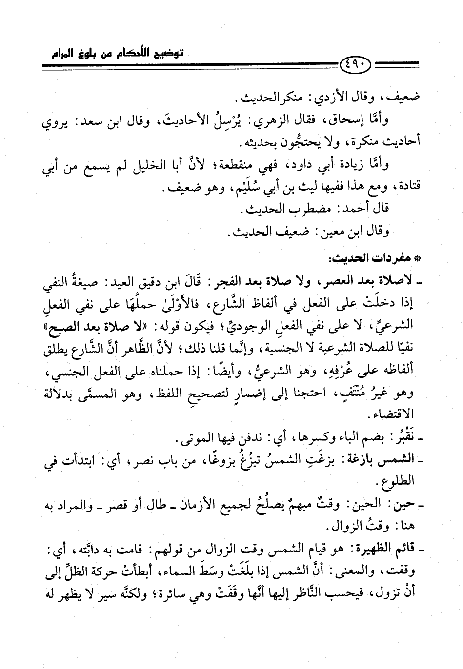 - لا صلاة بعد العصر، ولا صلاة بعد الفجر: قَالَ ابن دقيق العيد: صيغةُ النفي إذا دخلَتْ على الفعل في ألفاظ الشَّارع، فالأوْلَى حملُها على نفي الفعلِ الشرعيِّ، لا على نفي الفعلِ الوجوديِّ؛ فيكون قوله: "لا صلاة بعد الصبح" نفيًا للصلاة الشرعية لا الجنسية، وإنَّما قلنا ذلك؛ لأنَّ الظَّاهر أنَّ الشَّارع يطلق ألفاظه على عُرْفِهِ، وهو الشرعيُّ، وأيضًا: إذا حملناه على الفعل الجنسي، وهو غيرُ مُنْتَفٍ، احتجنا إلى إضمارٍ لتصحيح اللفظ، وهو المسمَّى بدلالة الاقتضاء.