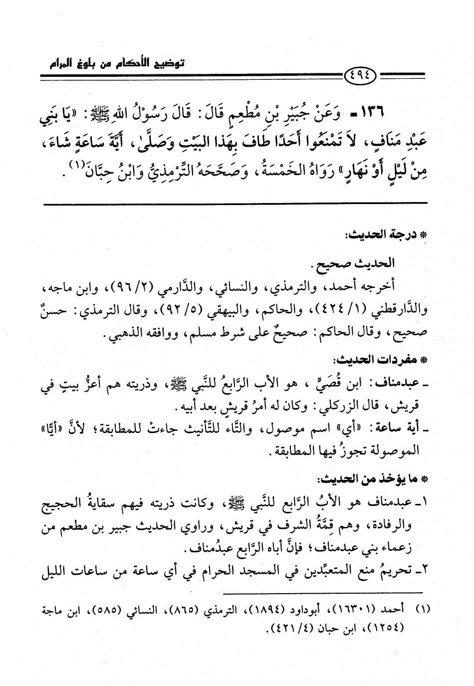 136 - وَعَنْ جُبَيْرِ بْنِ مُطْعِمٍ قَالَ: قَالَ رَسُولُ اللَّهِ -صلى الله عليه وسلم-: "يَا بَنِي عَبْدِ مَنَافٍ, لَا تَمْنَعُوا أَحَدًا طَافَ بِهَذَا الْبَيْتِ وَصَلَّى، أَيَّةَ سَاعَةٍ شَاءَ، مِنْ لَيْلٍ أوْ نَهَارٍ" رَوَاهُ الْخَمْسَةُ, وَصَحَّحَهُ التِّرْمِذِيُّ وَابْنُ حِبَّانَ (¬1).