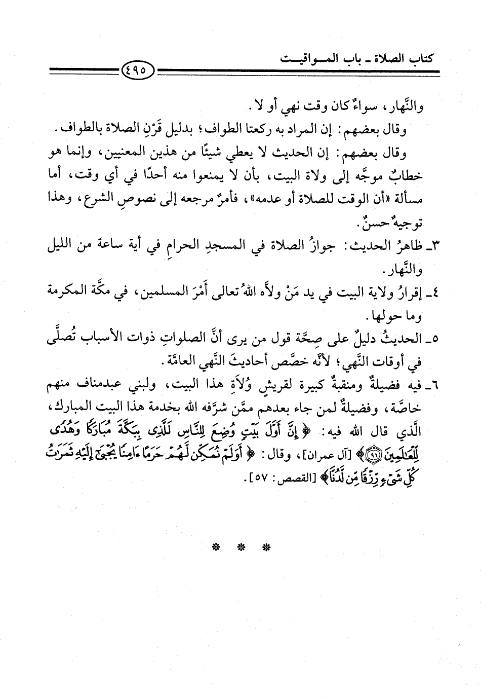 وقال بعضهم: إن الحديث لا يعطي شيئًا من هذين المعنيين، وإنما هو خطابٌ موجَّه إلى ولاة البيت، بأن لا يمنعوا منه أحدًا في أي وقت، أما مسألة "أن الوقت للصلاة أو عدمه"، فأمرٌ مرجعه إلى نصوصِ الشرع، وهذا توجيهٌ حسنٌ.
