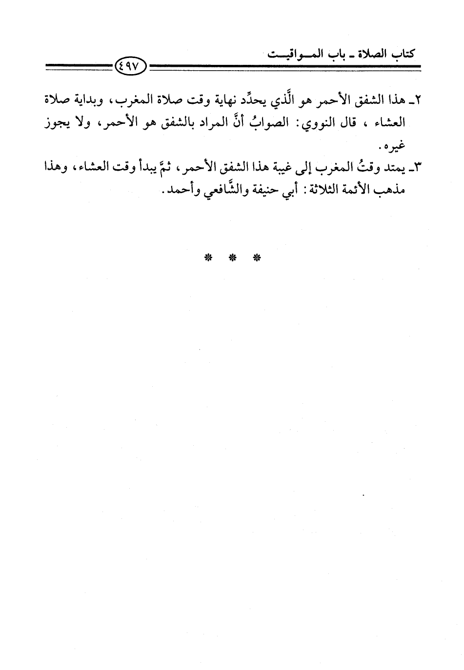 2 - هذا الشفق الأحمر هو الَّذي يحدِّد نهاية وقت صلاة المغرب، وبداية صلاة العشاء، قال النووي: الصوابُ أنَّ المراد بالشفق هو الأحمر، ولا يجوز غيره.