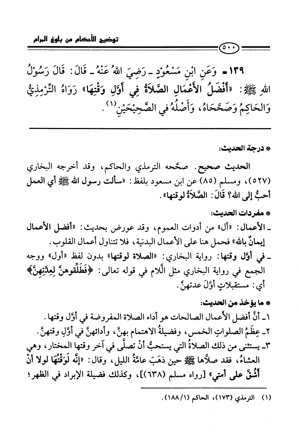 139 - وَعَنِ ابْنِ مَسْعُودٍ -رضي الله عنه- قَالَ: قَالَ رَسُولُ اللَّهِ -صلى الله عليه وسلم-: "أَفْضَلُ الْأَعْمَالِ الصَّلَاةُ فِي أَوَّلِ وَقْتِهَا" رَوَاهُ التِّرْمِذِيُّ وَالْحَاكِمُ وَصَحَّحَاهُ، وَأَصْلُهُ فِي الصَّحِيحَيْنِ (¬1).