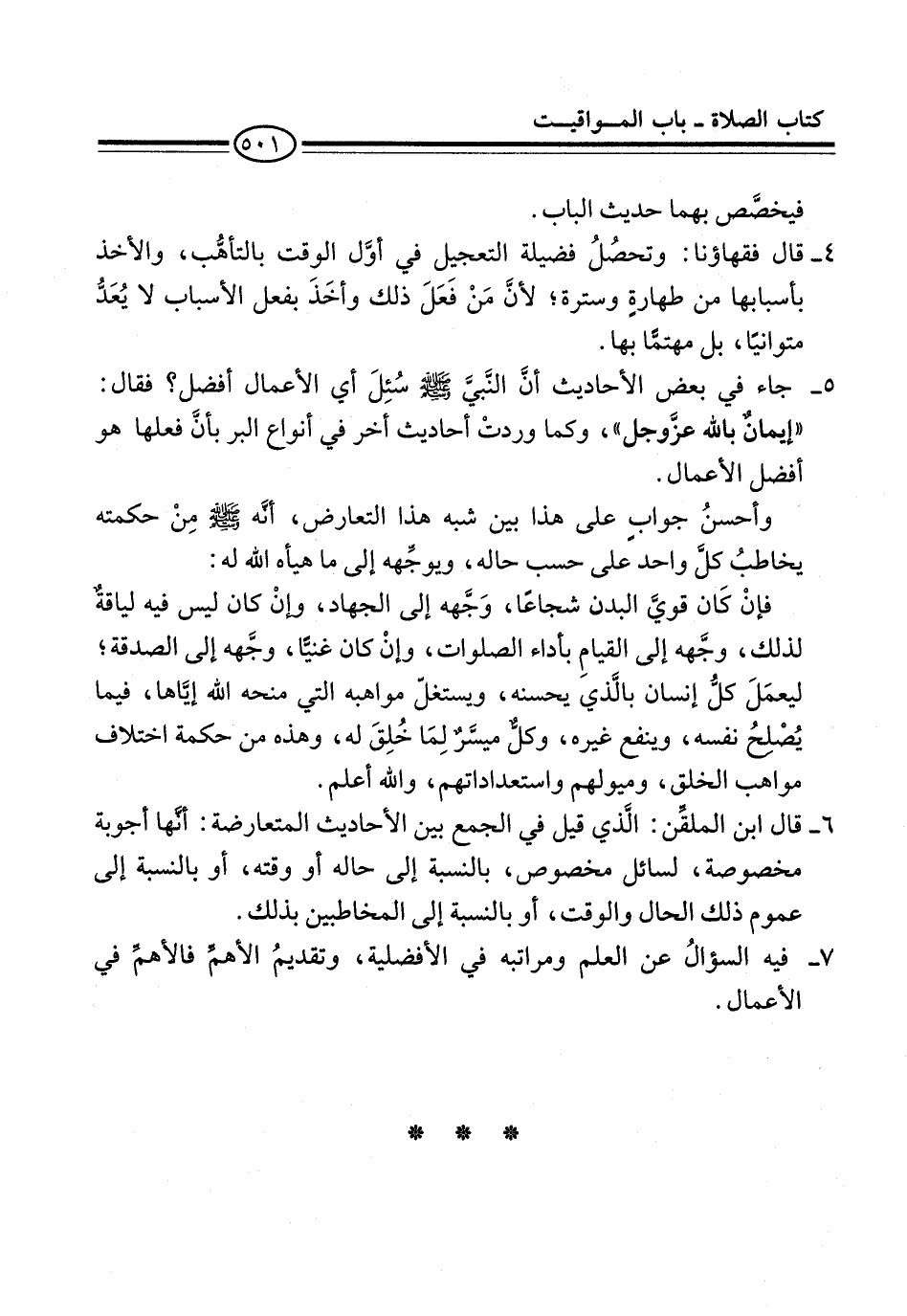 6 - قال ابن الملقن: الَّذي قيل في الجمع بين الأحاديث المتعارضة: أنَّها أجوبة مخصوصة، لمسائل مخصوص، بالنسبة إلى حاله أو وقته، أو بالنسبة إلى عموم ذلك الحال والوقت، أو بالنسبة إلى المخاطبين بذلك.