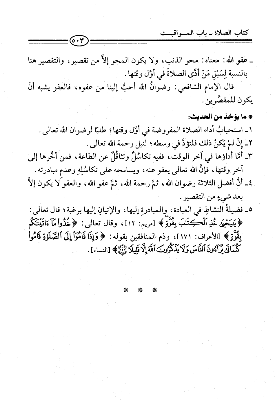 5 - فضيلةُ النشاط في العبادة، والمبادرةِ إليها، والإتيانِ إليها برغبة؛ قال تعالى: {يَايَحْيَى خُذِ الْكِتَابَ بِقُوَّةٍ} [مريم: 12]، وقال تعالى: {خُذُوا مَا آتَيْنَاكُمْ بِقُوَّةٍ} [الأعراف: 171]، وذم المنافقين بقوله: {وَإِذَا قَامُوا إِلَى الصَّلَاةِ قَامُوا كُسَالَى يُرَاءُونَ النَّاسَ وَلَا يَذْكُرُونَ اللَّهَ إِلَّا قَلِيلًا (142)} [النساء].
