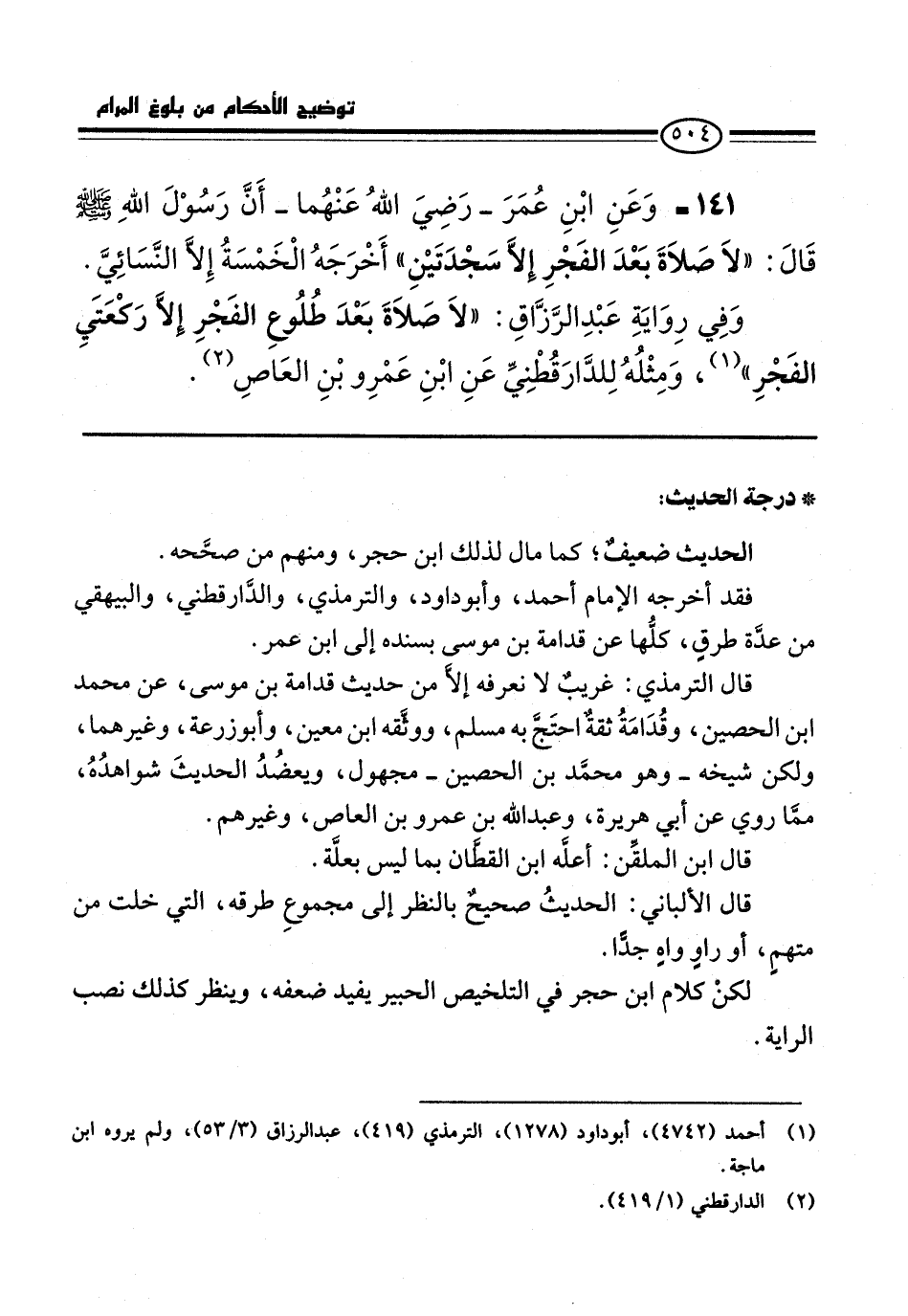 141 - وَعَنِ ابْنِ عُمَرَ -رَضِيَ اللهُ عَنْهُما- أَنَّ رَسُوْلَ اللهِ -صلى الله عليه وسلم- قَالَ: "لاَ صَلاَةَ بَعْدَ الفَجْرِ إلاَّ سَجْدَتَيْنِ" أَخْرَجَهُ الْخَمْسَةُ إِلاَّ النَّسَائِيَّ.