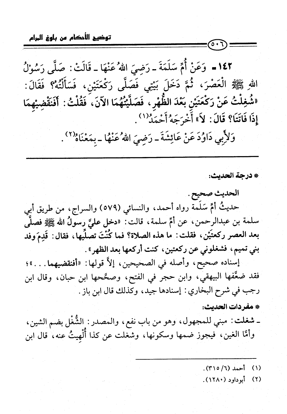 142 - وَعَنْ أُمِّ سَلَمَةَ -رَضِيَ اللهُ عَنْهَا- قَالَتْ: صَلَّى رَسُوْلُ اللهِ -صلى الله عليه وسلم- الْعَصْرَ، ثُمَّ دَخَلَ بَيْتِي فَصَلَّى رَكْعَتَيْنِ، فَسَأَلْتُهُ؟ فَقَالَ: "شُغِلْتُ عَنْ رَكْعَتَيْنِ بَعْدَ الظُّهْرِ، فَصَلَّيْتُهُمَا الآنَ، فَقُلْتُ: أفَنَقْضِيْهِمَا إذَا فَاتَتَا؟ قَالَ: لاَ" أَخْرَجَهُ أَحْمَدُ (¬1).