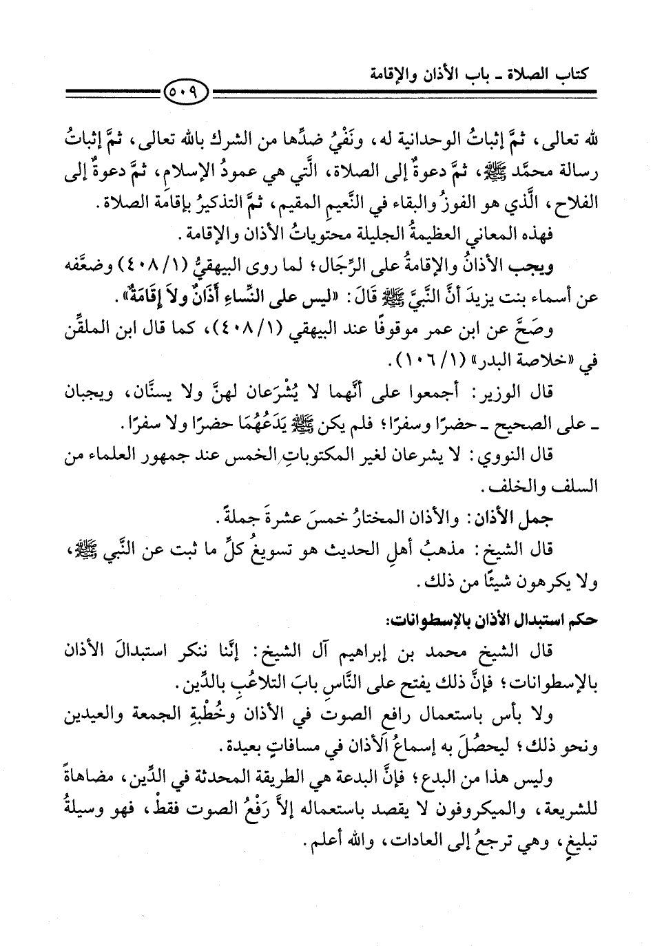 قال الشيخ محمد بن إبراهيم آل الشيخ: إنَّنا ننكر استبدالَ الأذان بالإسطوانات؛ فإنَّ ذلك يفتح على النَّاسِ بابَ التلاعُبِ بالدِّين.