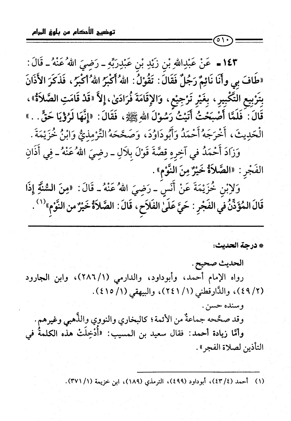 143 - عَنْ عَبْدِ اللهِ بْنِ زَيْدِ بْنِ عَبْدِ رَبِّهِ -رَضِيَ اللهُ عَنْهُ- قَالَ: "طَافَ بِي وأنَا نَائِمٌ رَجُلٌ فَقَالَ: تَقُوْلُ: اللهُ أَكْبَرُ اللهُ أَكْبَرُ، فَذَكرَ الأَذَانَ بِتَرْبِيعِ التَّكبِيرِ، بِغَيْرِ تَرْجِيْعٍ، وَالإِقَامَةَ فُرَادَى، إِلاَّ "قَدْ قَامَتِ الصَّلاَةُ"، قَالَ: فَلَمَّا أصْبَحْتُ أتيْتُ رَسُوْلَ اللهِ -صلى الله عليه وسلم-، فَقَالَ: "إِنَّهَا لَرؤْيَا حَقٍّ .. " الْحَدِيثَ، أَخْرَجَهُ أَحْمَدُ وَأَبُو دَاوُدَ، وَصَحَّحَهُ التِّرْمِذِيُّ وَابْنُ خُزَيْمَةَ.