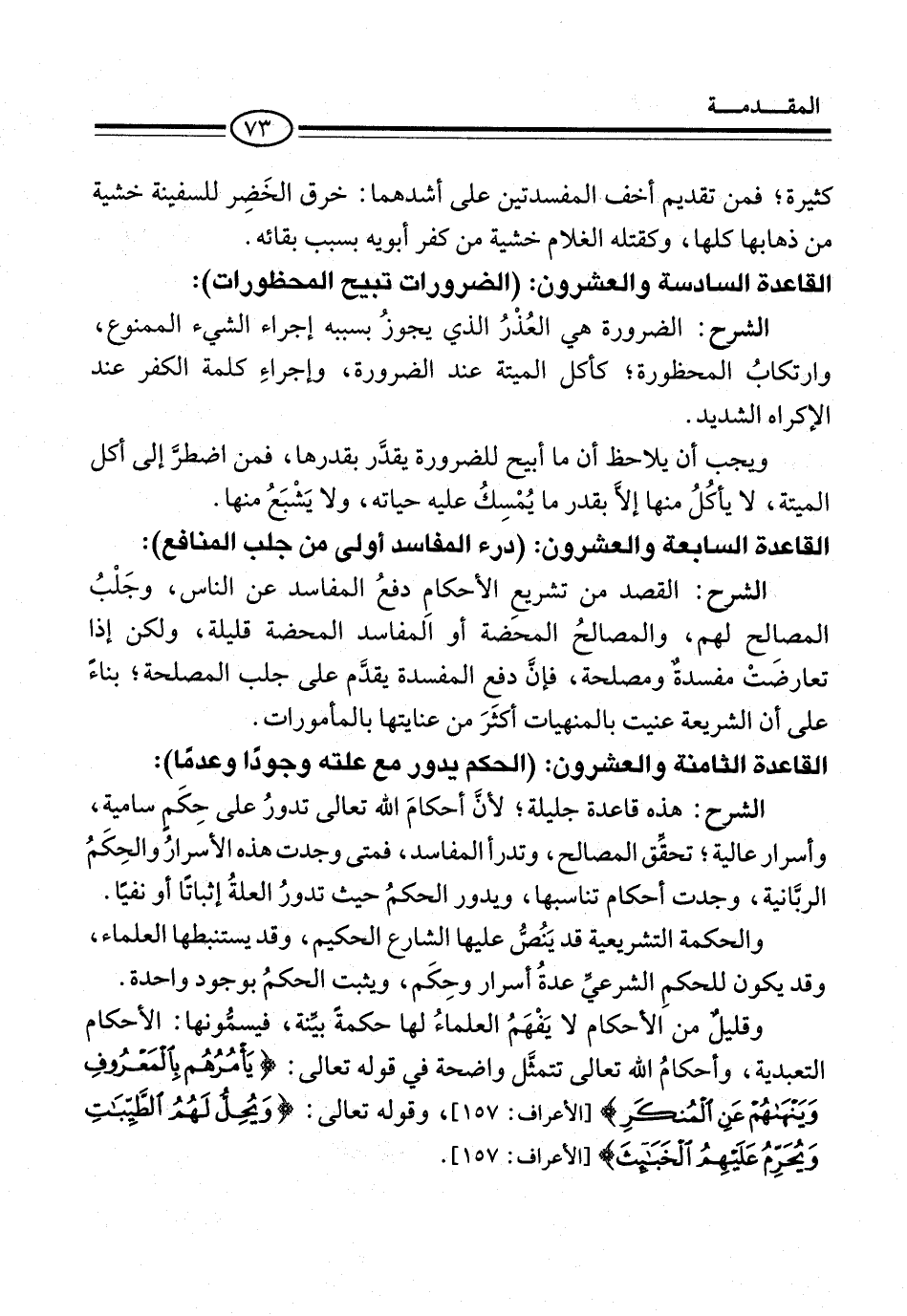 الشرح: القصد من تشريعِ الأحكام دفعُ المفاسد عن الناس، وجَلْبُ المصالح لهم، والمصالحُ المحضة أو المفاسد المحضة قليلة، ولكن إذا تعارضَتْ مفسدةٌ ومصلحة، فإن دفع المفسدة يقدَّم على جلب المصلحة؛ بناءً على أن الشريعة عنيت بالمنهيات أكثَرَ من عنايتها بالمأمورات.