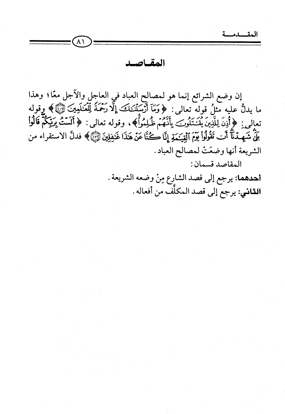 إن وضع الشرائع إنما هو لمصالح العباد في العاجل والآجل معًا، وهذا ما يدلُّ عليه مثلُ قوله تعالى: {وَمَا أَرْسَلْنَاكَ إِلَّا رَحْمَةً لِلْعَالَمِينَ (107)}، وقوله تعالى: {أُذِنَ لِلَّذِينَ يُقَاتَلُونَ بِأَنَّهُمْ ظُلِمُوا}، وقوله تعالى: {أَلَسْتُ بِرَبِّكُمْ قَالُوا بَلَى شَهِدْنَا أَنْ تَقُولُوا يَوْمَ الْقِيَامَةِ إِنَّا كُنَّا عَنْ هَذَا غَافِلِينَ} فدلَّ الاستقراء من الشريعة أنها وضعَتْ لمصالح العباد.