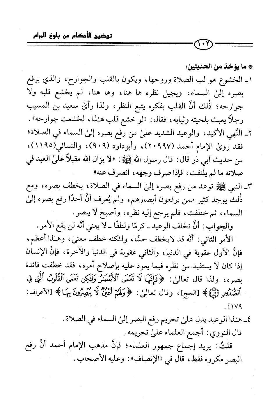 1 - الخشوع هو لب الصلاة وروحها، ويكون بالقلب والجوارح، والذي يرفع بصره إلى السماء، ويجيل نظره هاهنا، وهاهنا، لم يخشع قلبه ولا جوارحه؛ ذلك أنَّ القلب بفكره يتبع النظر، ولذا رأى سعيد بن المسيب رجلًا يعبث بلحيته وثيابه، فقال: "لو خشع قلب هذا، لخشعت جوارحه".
