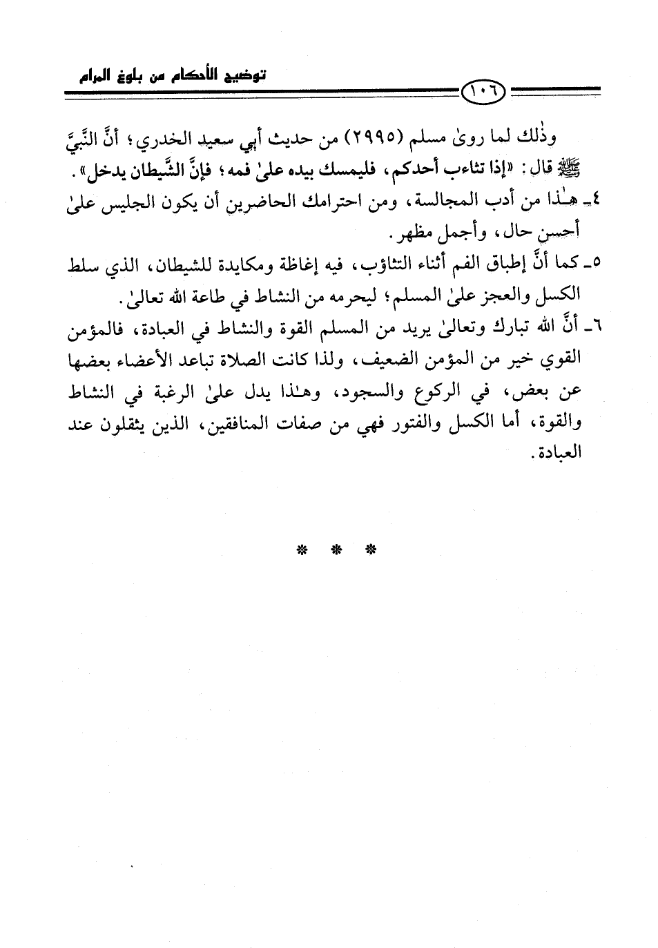 5 - كما أن إطباق الفم أثناء التثاؤب، فيه إغاظة ومكايدة للشيطان، الذي سلط الكسل والعجز على المسلم؛ ليحرمه من النشاط في طاعة الله تعالى.