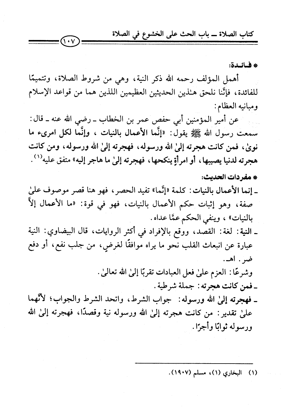 أهمل المؤلف رحمه الله ذكر النية، وهي من شروط الصلاة، وتتميمًا للفائدة، فإنَّنا نلحق هذين الحديثين العظيمين اللذين هما من قواعد الإِسلام ومبانيه العظام: