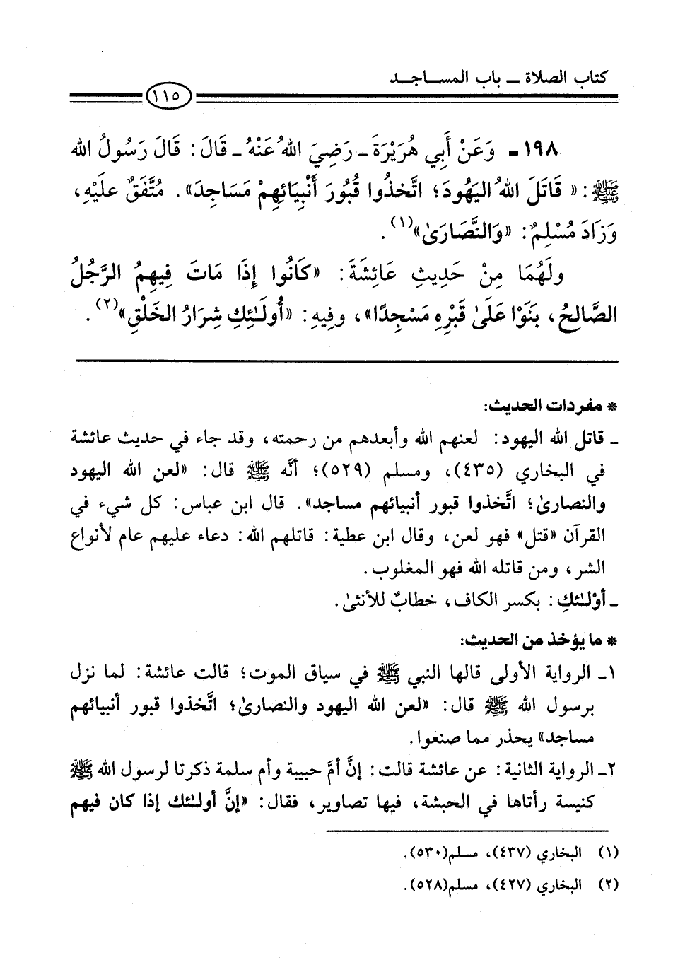 198 - وَعَنْ أَبِي هُرَيْرَةَ -رَضِيَ اللهُ عَنْهُ- قَالَ: قالَ رَسُولُ الله -صلى الله عليه وسلم-: "قَاتَلَ اللهُ اليَهُودَ؛ اتَّخذُوا قُبُورَ أَنْبِيَائِهِمْ مَسَاجِدَ". مُتَّفَق علَيْهِ، وَزَادَ مُسْلِمٌ: "وَالنَّصَارَى" (¬1).