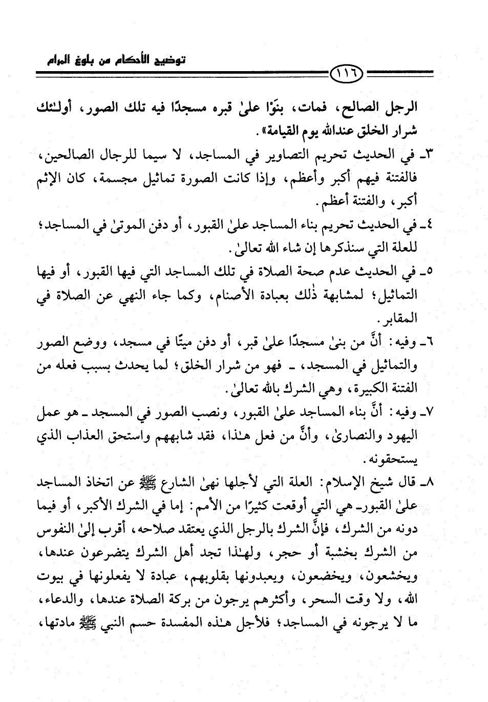 8 - قال شيخ الإِسلام: العلة التي لأجلها نهى الشارع -صلى الله عليه وسلم- عن اتخاذ المساجد على القبور -هي التي أوقعت كثيرًا من الأمم: إما في الشرك الأكبر، أو فيما دونه من الشرك، فإنَّ الشرك بالرجل الذي يعتقد صلاحه، أقرب إلى النفوس من الشرك بخشبة أو حجر، ولهذا تجد أهل الشرك يتضرعون عندها، ويخشعون، ويخضعون، ويعبدونها بقلوبهم، عبادة لا يفعلونها في بيوت الله، ولا وقت السحر، وأكثرهم يرجون من بركة الصلاة عندها، والدعاء، ما لا يرجونه في المساجد؛ فلأجل هذه المفسدة حسم النبي -صلى الله عليه وسلم- مادتها،
