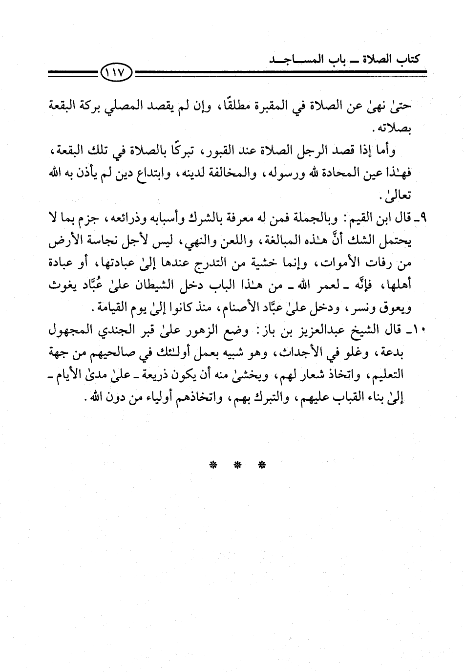 9 - قال ابن القيم: وبالجملة فمن له معرفة بالشرك وأسبابه وذرائعه، جزم بما لا يحتمل الشك أنَّ هذه المبالغة، واللعن والنهي، ليس لأجل نجاسة الأرض من رفات الأموات، وإنما خشية من التدرج عندها إلى عبادتها، أو عبادة أهلها، فإنَّه -لعمر الله- من هذا الباب دخل الشيطان على عُبَّاد يغوث ويعوق ونسر، ودخل على عبَّاد الأصنام، منذ كانوا إلى يوم القيامة.