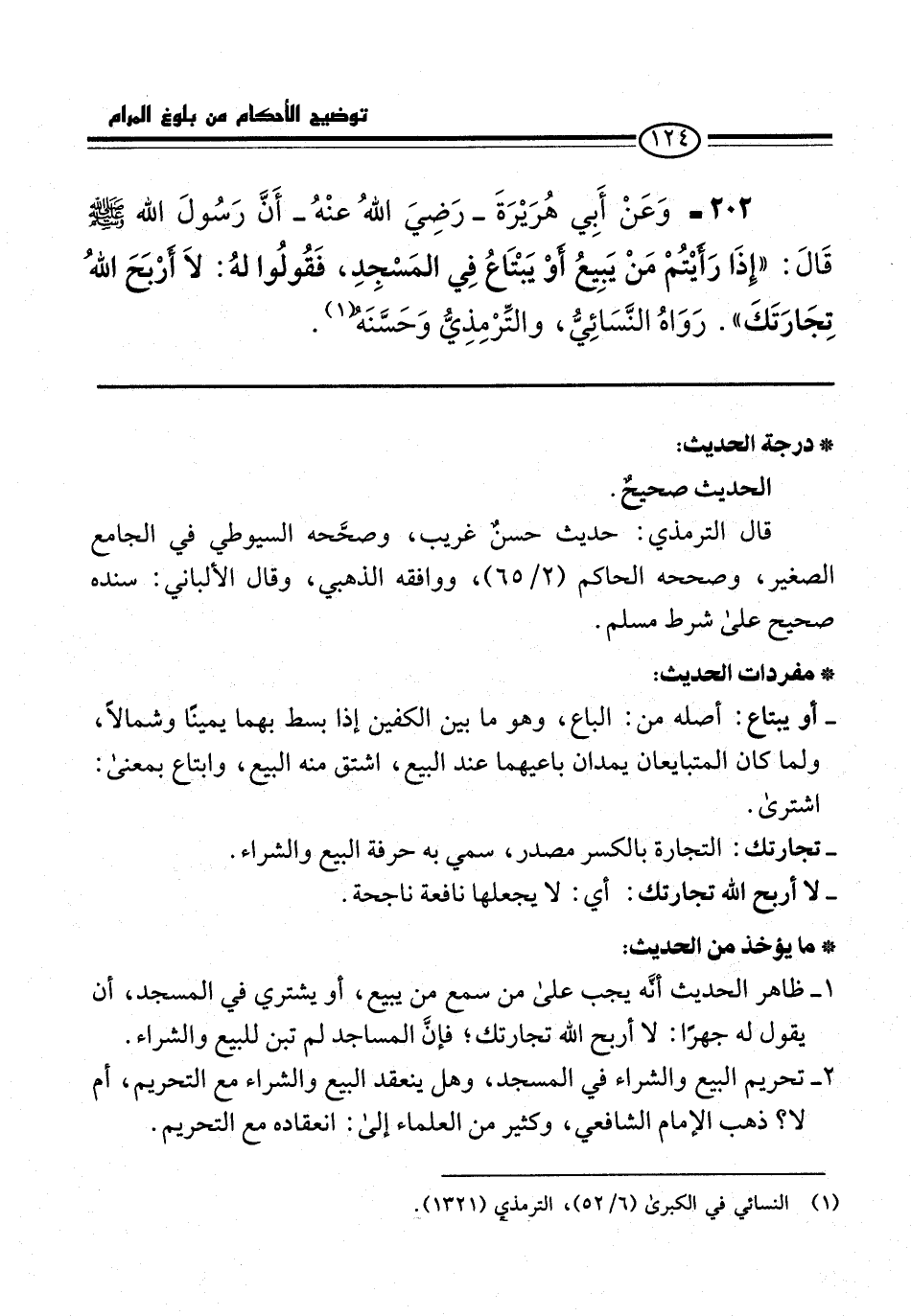 202 - وَعَنْ أَبِي هُرَيْرَةَ -رَضِيَ اللهُ عنْهُ- أَنَّ رَسُولَ الله -صلى الله عليه وسلم- قَالَ: "إِذَا رَأيْتُمْ مَنْ يَبِيعُ أوْ يَبْتَاعُ فِي المَسْجِدِ، فَقُولُوا لهُ: لاَ أرْبَحَ اللهُ تِجَارَتَكَ". رَوَاهُ النَّسَائيُّ، والتِّرْمِذِيُّ وَحَسَّنَهُ (¬1).