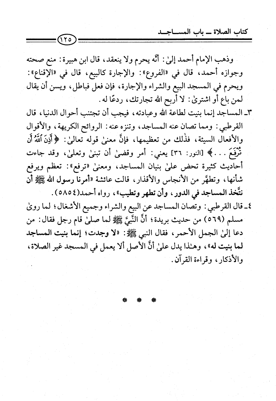 4 - قال القرطبي: وتصان المساجد عن البيع والشراء وجميع الأشغال؛ لما روى مسلم (569) من حدثني بريدة؛ أنَّ النَّبيَّ -صلى الله عليه وسلم- لما صلى قام رجل فقال: من دعا إلى الجمل الأحمر، فقال النبي -صلى الله عليه وسلم-: "لا وجدت؛ إنما بنيت المساجد لما بنيت له"، وهذا يدل على أنَّ الأصل ألا يعمل في المسجد غير الصلاة، والأذكار، وقراءة القرآن.