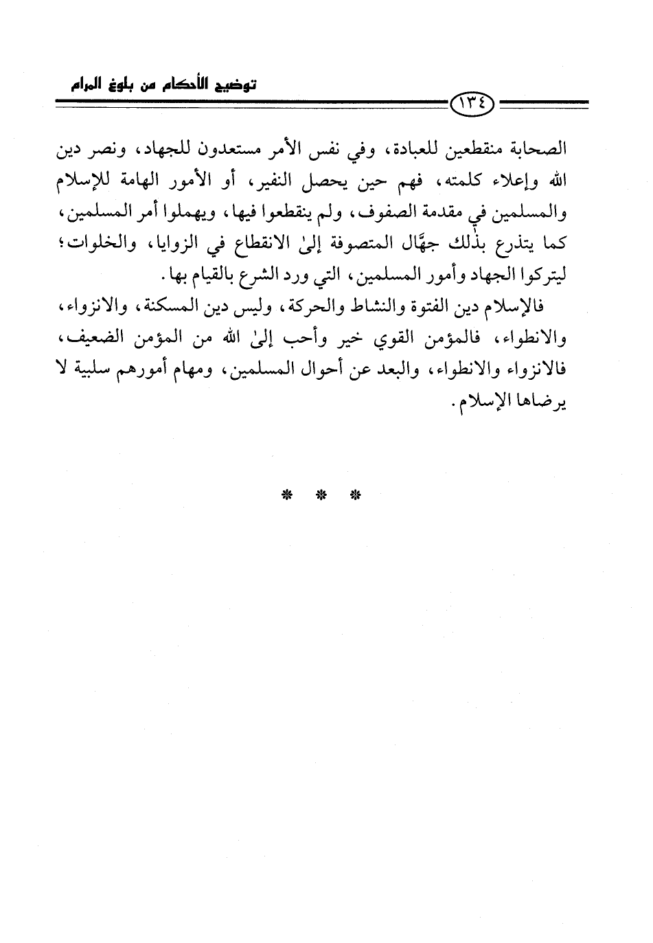 الصحابة منقطعين للعبادة، وفي نفس الأمر مستعدون للجهاد، ونصر دين الله وإعلاء كلمته، فهم حين يحصل النفير، أو الأمور الهامة للإسلام والمسلمين في مقدمة الصفوف، ولم ينقطعوا فيها، ويهملوا أمر المسلمين، كما يتذرع بذلك جهَّال المتصوفة إلى الانقطاع في الزوايا، والخلوات؛ ليتركوا الجهاد وأمور المسلمين، التي ورد الشرع بالقيام بها.