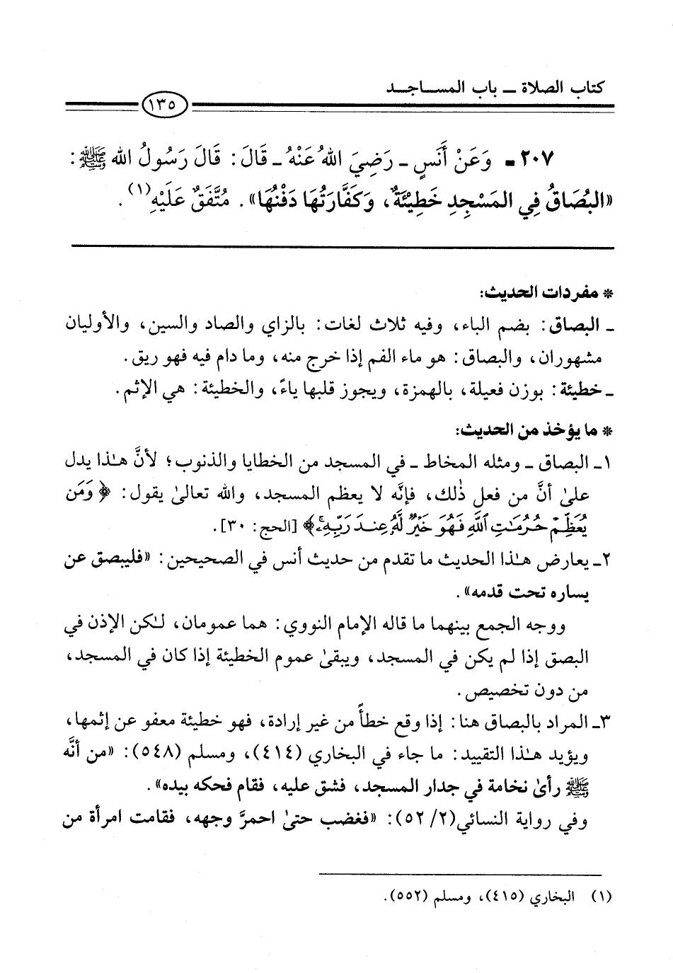 207 - وَعَنْ أَنَسٍ -رَضِيَ اللهُ عَنْهُ- قَالَ: قَالَ رَسُولُ الله -صلى الله عليه وسلم-: "البُصَاقُ في المَسْجِدِ خَطِيْئَةٌ، وَكَفَّارَتُهَا دَفْنُهَا". مُتَّفَقٌ عَلَيْهِ (¬1).