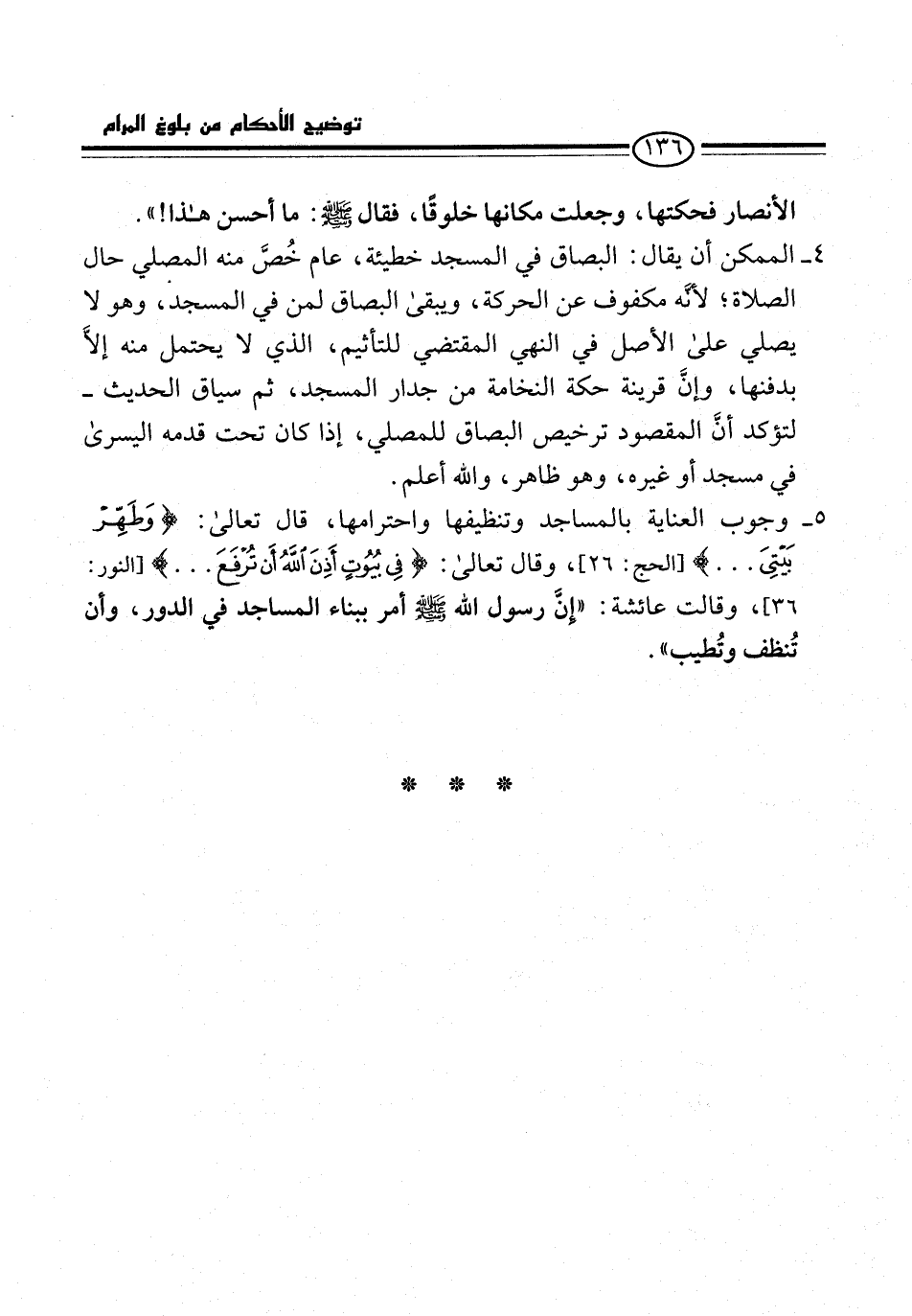 5 - وجوب العناية بالمساجد وتنظيفها واحترامها، قال تعالى: {وَطَهِّرْ بَيْتِيَ ...} [الحج: 26]، وقال تعالى: {فِي بُيُوتٍ أَذِنَ اللَّهُ أَنْ تُرْفَعَ ...} [النور: 36]، وقالت عائشة: "إنَّ رسول الله -صلى الله عليه وسلم- أمر ببناء المساجد في الدور، وأن تُنظف وتُطيب".