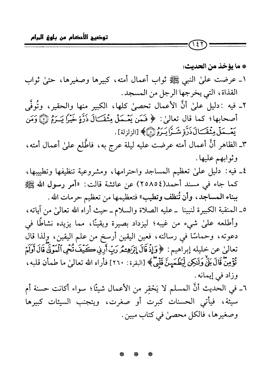 1 - عرضت على النبي -صلى الله عليه وسلم- ثواب أعمال أمته، كبيرها وصغيرها، حتى ثواب القذاة، التي يخرجها الرجل من المسجد.