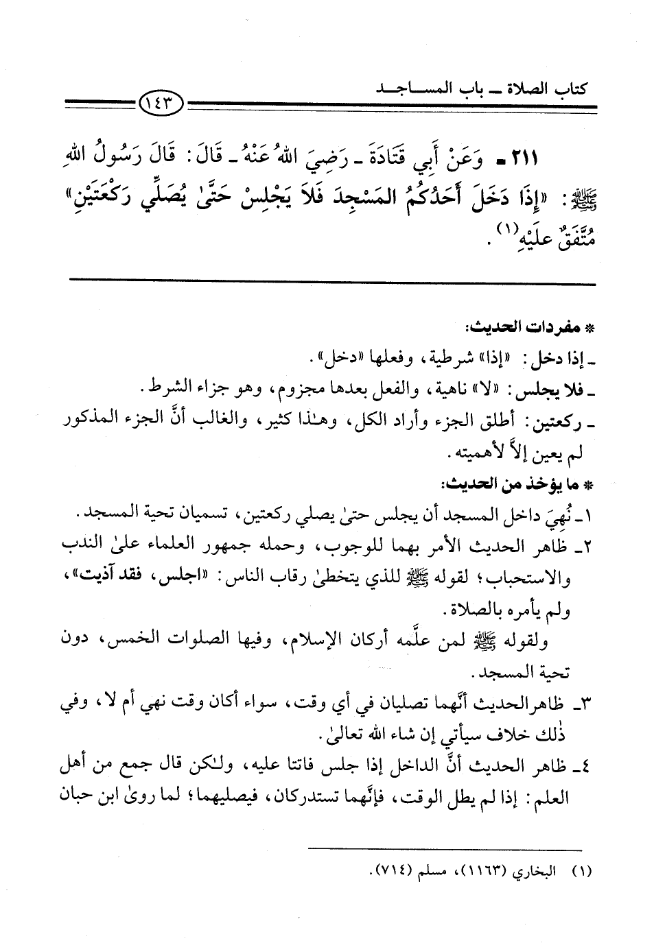 211 - وَعَنْ أَبِي قتادَةَ -رَضِيَ اللهُ عَنْهُ- قَالَ: قَالَ رَسُولُ اللهِ -صلى الله عليه وسلم-: "إِذَا دَخَلَ أحَدُكُمُ المَسْجِدَ فَلاَ يَجْلِسْ حَتَّى يُصَلِّي رَكْعَتَيْنِ" مُتَّفَقٌ علَيْهِ (¬1).