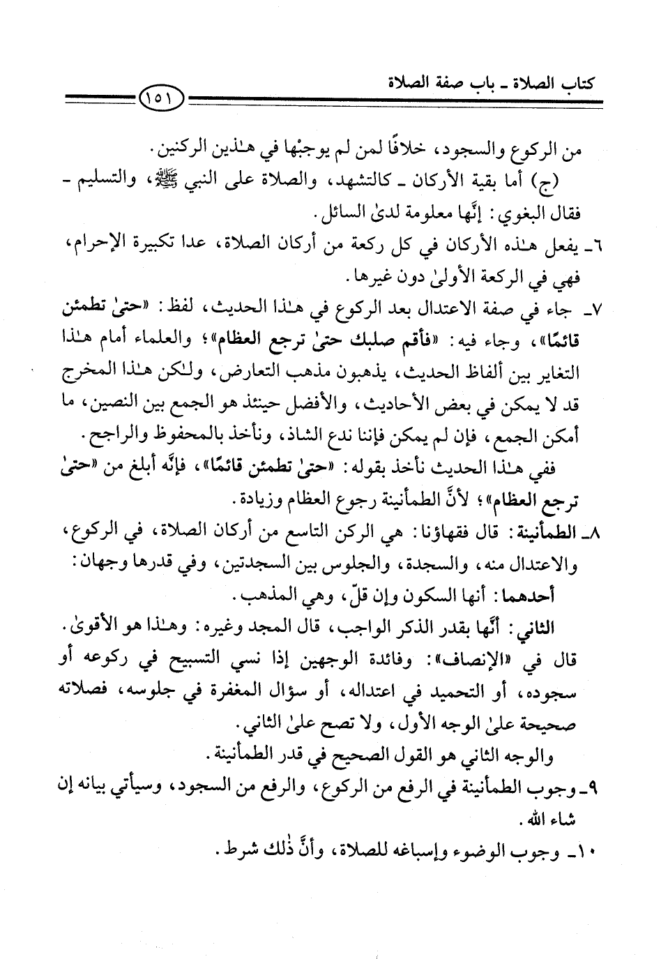 8 - الطمأنينة: قال فقهاؤنا: هي الركن التاسع من أركان الصلاة، في الركوع، والاعتدال منه، والسجدة، والجلوس بين السجدتين، وفي قدرها وجهان: أحدهما: أنها السكون وإن قلّ، وهي المذهب.