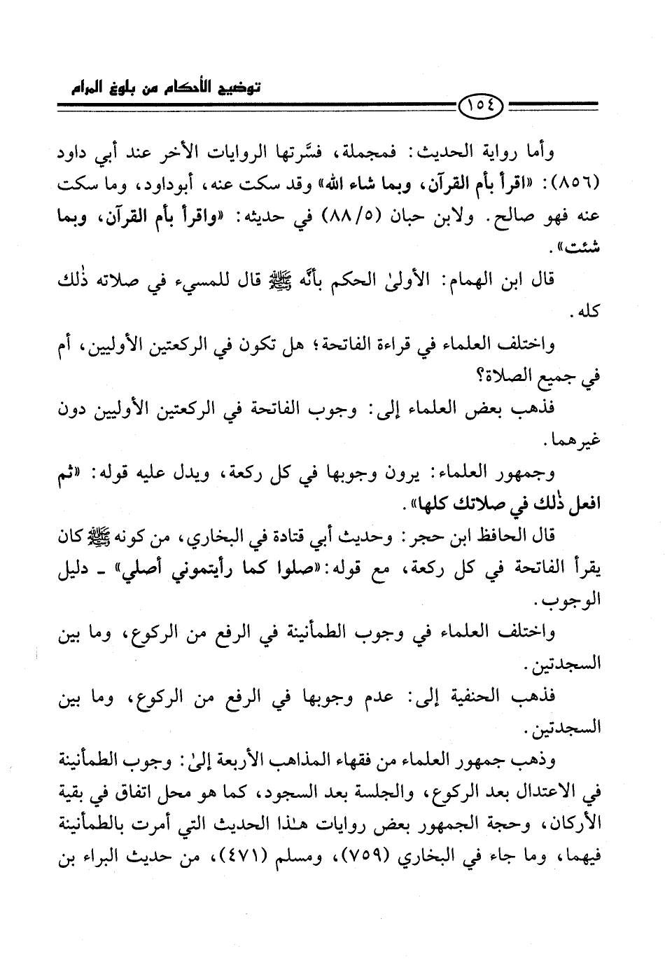 وذهب جمهور العلماء من فقهاء المذاهب الأربعة إلى: وجوب الطمأنينة في الاعتدال بعد الركوع، والجلسة بعد السجود، كما هو محل اتفاق في بقية الأركان، وحجة الجمهور بعض روايات هذا الحديث التي أمرت بالطمانينة فيهما، وما جاء في البخاري (759)، ومسلم (471)، من حديث البراء بن