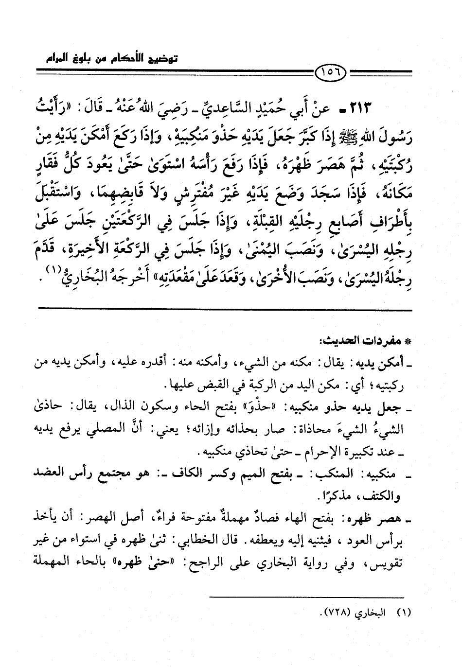 213 - عنْ أَبي حُمَيْدٍ السَّاعِديِّ -رَضِيَ اللهُ عَنْهُ- قَالَ: "رَأيْتُ رَسُولَ اللهِ -صلى الله عليه وسلم- إِذَا كَبَّرَ جَعَلَ يَدَيْهِ حَذْوَ مَنكِبيَه، وَإذَا رَكعَ أمْكَنَ يَدَيْهِ مِنْ رُكْبَتَيْهِ، ثُمَّ هَصَرَ ظَهْرَهُ، فَإذَا رَفَعَ رَأْسَهُ اسْتَوَى حَتَّى يَعُودَ كلُّ فَقَارٍ مَكَانَهُ، فَإذَا سَجَدَ وَضَعَ يَدَيْهِ غَيْرَ مُفْتَرِشٍ وَلاَ قَابِضِهِمَا، وَاسْتَقْبلَ بِأَطْرَافِ أصَابعِ رِجْلَيْهِ القِبْلَةِ، وإِذَا جَلَسَ في الرَّكْعَتَيْنِ جَلَسَ عَلَى رِجْلِهِ اليُسْرَى، وَنَصَبَ اليُمْنَى، وَإذَا جَلَسَ في الرَّكْعَةِ الأَخِيرَةِ، قَدَّمَ رِجْلَهُ اليُسْرَى، وَنَصَبَ الأُخرَى، وَقَعَدَ عَلَى مَقْعَدَتِهِ" أَخْرجَهُ البُخَارِيُّ (¬1).