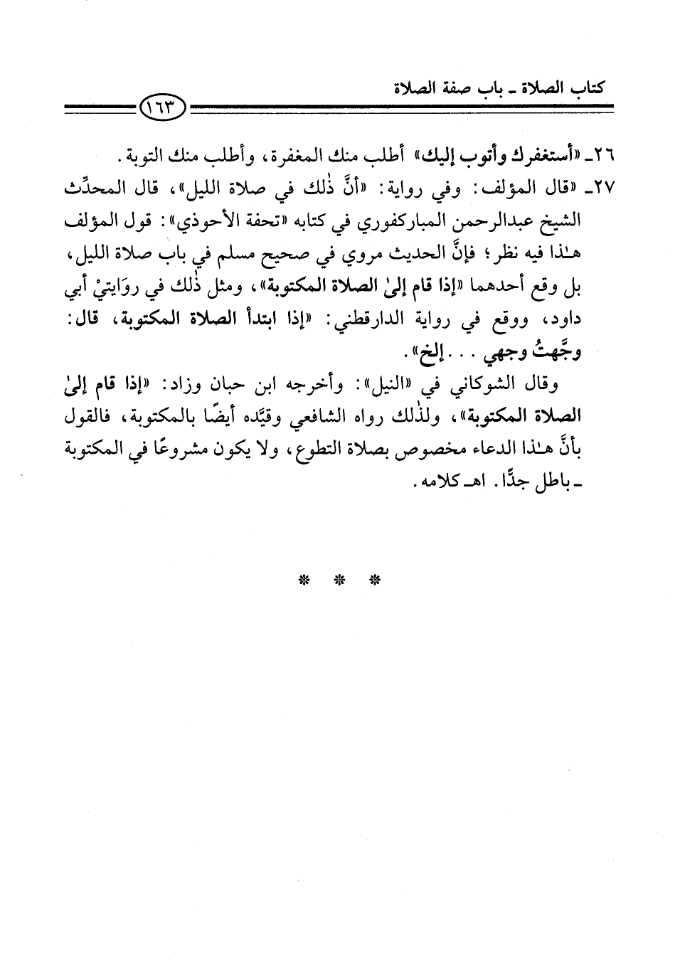 27 - "قال المؤلف: وفي رواية: "أنَّ ذلك في صلاة الليل"، قال المحدِّث الشيخ عبد الرحمن المباركفوري في كتابه "تحفة الأحوذي": قول المؤلف هذا فيه نظر؛ فإنَّ الحديث مروي في صحيح مسلم في باب صلاة الليل، بل وقع أحدهما "إذا قام إلى الصلاة المكتوبة"، ومثل ذلك في روَايتيْ أبي داود، ووقع في رواية الدارقطني: "إذا ابتدأ الصلاة المكتوبة، قال: وجَّهتُ وجهي ... إلخ".