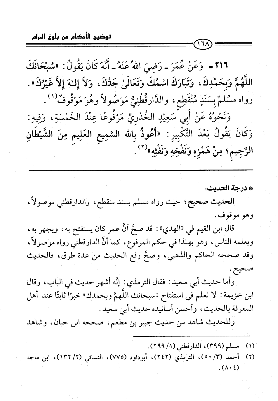 216 - وَعَنْ عُمَرَ -رَضِيَ اللهُ عَنْهُ- أَنَّهُ كَانَ يَقُولُ: "سُبْحَانَكَ اللَّهُمَّ وَبِحَمْدِكَ، وَتَبارَكَ اسْمُكَ وَتَعَالَى جَدُكَ، وَلاَ إِلهَ إِلاَّ غَيْرُكَ". رواه مسُلمٌ بِسَنَدٍ مُنْقَطِعٍ، والدَّارقُطْنِيُّ مَوْصُولًا وهُوَ مَوْقُوفٌ (¬1).