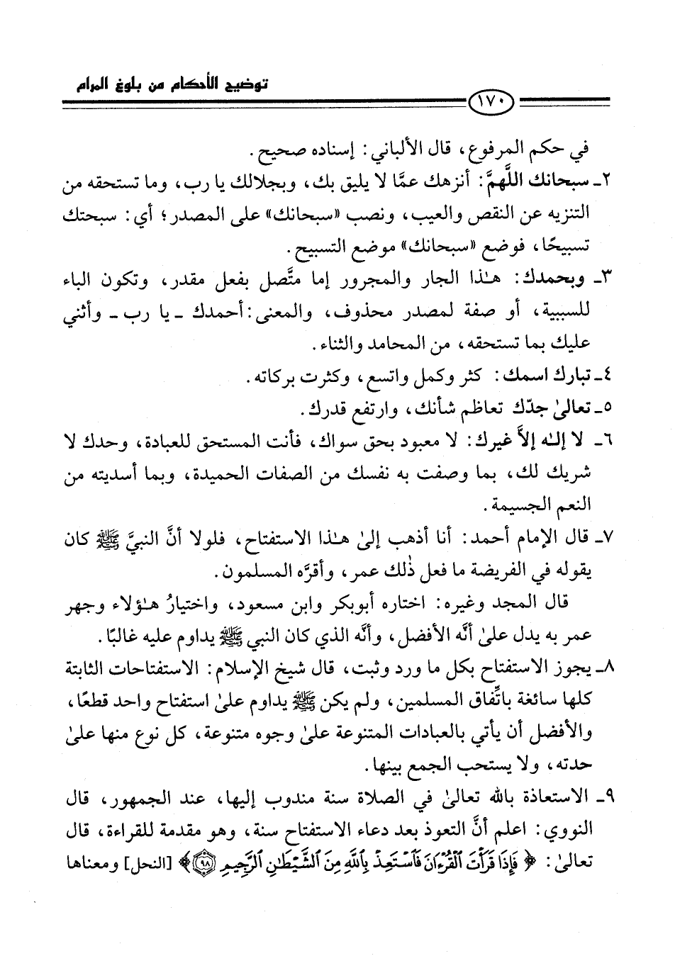 7 - قال الإِمام أحمد: أنا أذهب إلى هذا الاستفتاح، فلولا أنَّ النبيَّ -صلى الله عليه وسلم- كان يقوله في الفريضة ما فعل ذلك عمر، وأقرَّه المسلمون.