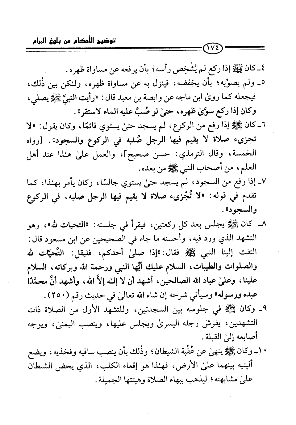 6 - كان -صلى الله عليه وسلم- إذا رفع من الركوع، لم يسجد حتى يستوي قائمًا، وكان يقول: "لا تجزىء صلاة لا يقيم فيها الرجل صُلبه في الركوع والسجود". [رواه الخمسة، وقال الترمذي: حسن صحيح]، والعمل على هذا عند أهل العلم، من أصحاب النبي -صلى الله عليه وسلم- من بعده.