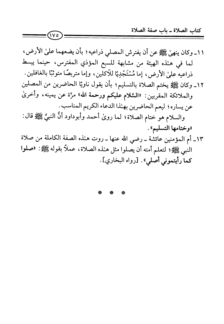 12 - وكان -صلى الله عليه وسلم- يختم الصلاة بالتسليم؛ بأن يقول ناويًا الحاضرين من المصلين والملائكة المقربين: "السَّلام عليكم ورحمة الله" مرَّة عن يمينه، وأخرى عن يساره؛ ليعم الحاضرين بهذا الدعاء الكريم المناسب.