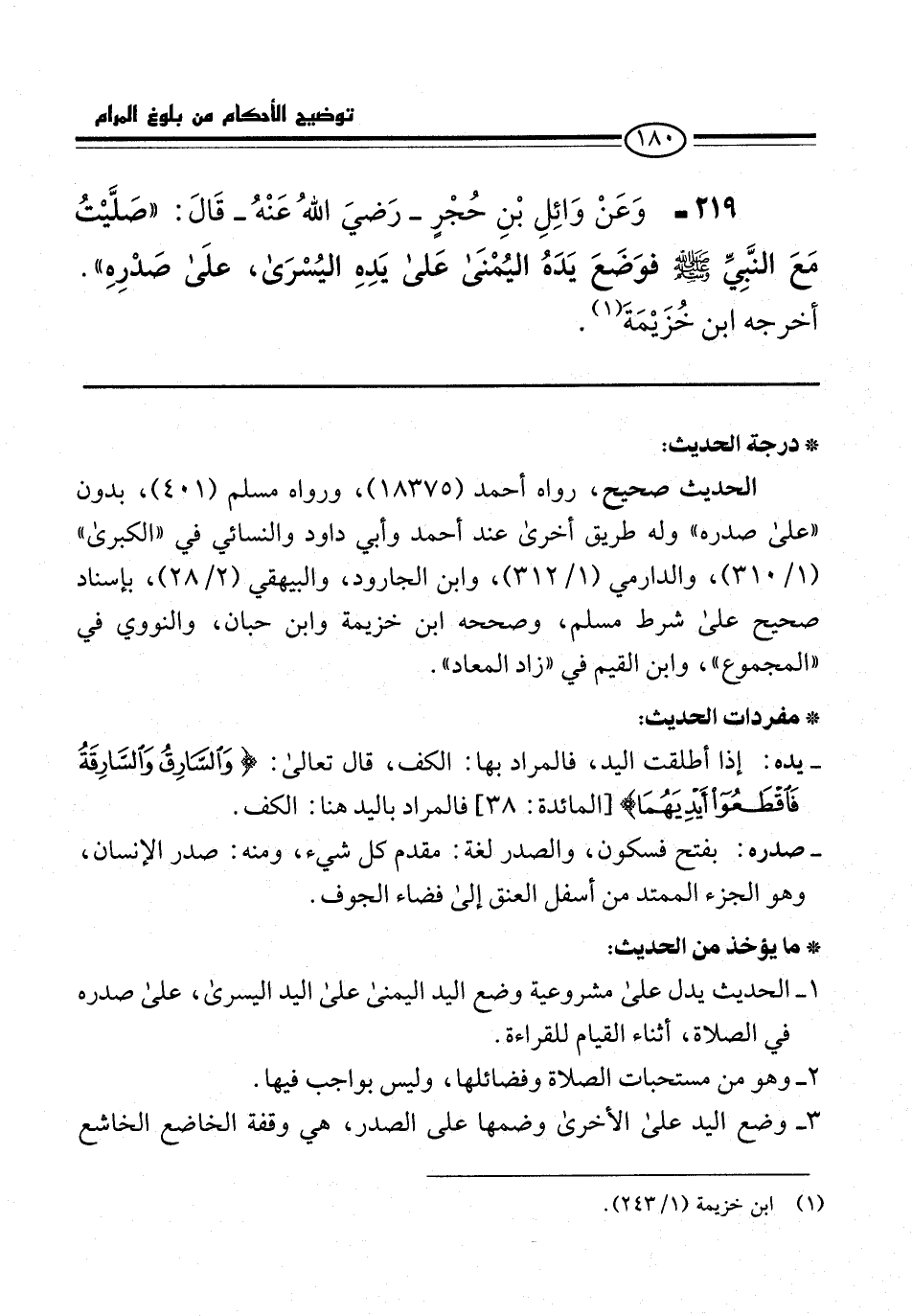 219 - وَعَنْ وَائِلِ بْنِ حُجْرٍ -رَضيَ اللهُ عَنْهُ- قَالَ: "صَلَّيْتُ مَعَ النَّبِيِّ -صلى الله عليه وسلم- فوَضَعَ يَدَهُ اليُمْنَى عَلى يَدِهِ اليُسْرَى، علَى صَدْرِهِ". أخرجه ابن خُزَيْمَةَ (¬1).