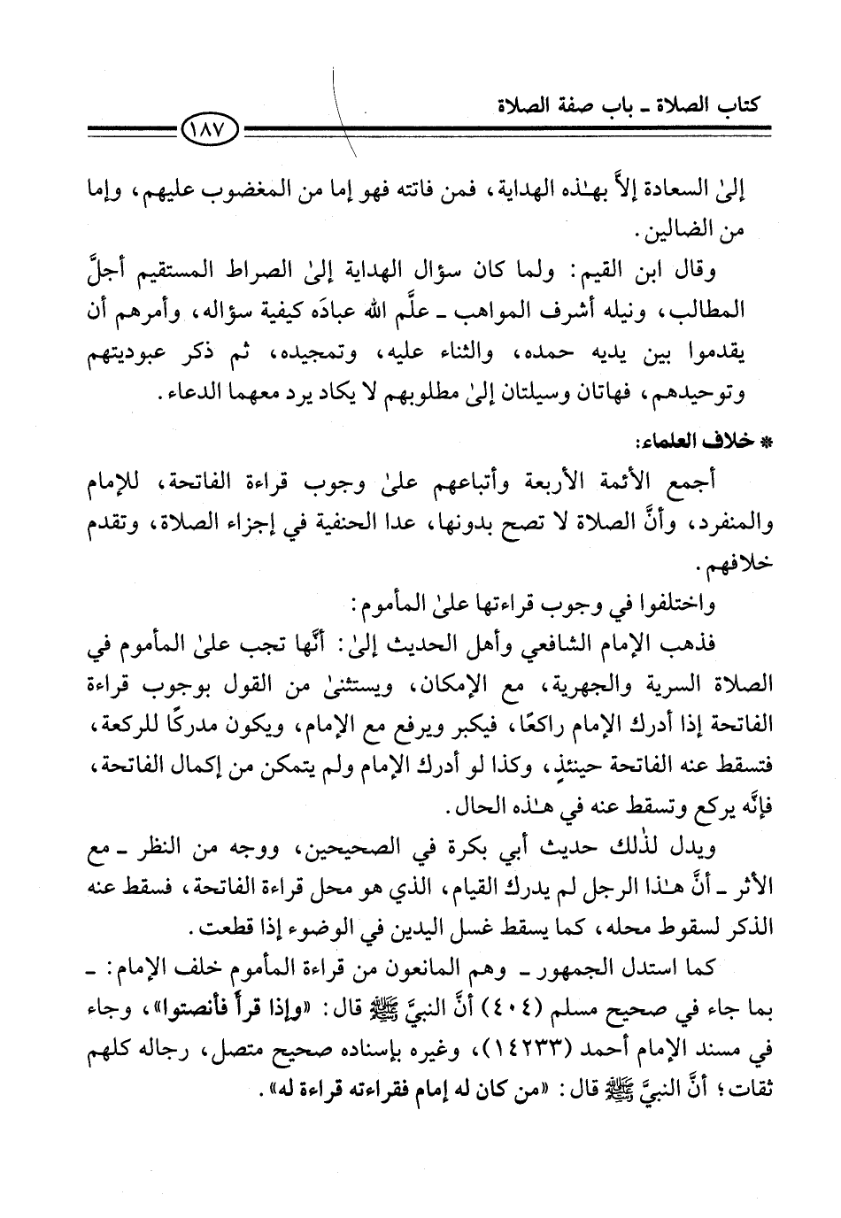 أجمع الأئمة الأربعة وأتباعهم على وجوب قراءة الفاتحة، للإمام والمنفرد، وأنَّ الصلاة لا تصح بدونها، عدا الحنفية في إجزاء الصلاة، وتقدم خلافهم.