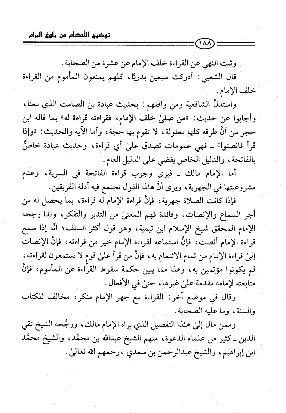 قال الشعبي: أدركت سبعين بدريًّا، كلهم يمنعون المأموم من القراءة خلف الإِمام.