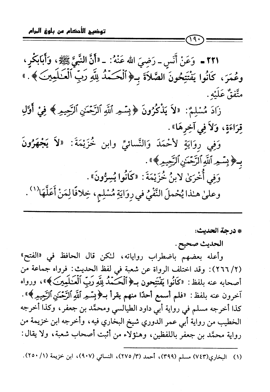 221 - وَعَنْ أَنَسٍ -رَضِيَ الله عَنْهُ:- "أَنَّ النَّبِيَّ -صلى الله عليه وسلم-، وَأَبَا بَكْرٍ، وعُمَرَ، كانُوا يَفْتَتِحُونَ الصَّلاَةَ بِـ {الْحَمْدُ لِلَّهِ رَبِّ الْعَالَمِينَ}." متَّفقٌ عَلَيْهِ.
