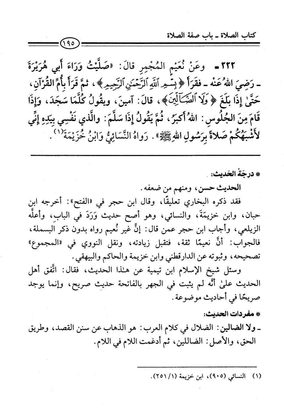 222 - وعَنْ نُعَيْمٍ المُجْمِرِ قالَ: "صَلَّيْتُ وَرَاءَ أبي هُرَيْرَةَ -رَضِيَ اللهُ عَنْه- فقَرَأ {بِسْمِ اللَّهِ الرَّحْمَنِ الرَّحِيمِ}، ثمَّ قَرَأ بِأُمِّ القُرْآنِ، حَتَّى إذا بلَغَ {وَلَا الضَّالِّينَ}، قالَ: آمينَ، ويقُولُ كُلَّمَا سَجَدَ، وَإِذَا قَامَ مِنَ الجُلُوسِ: اللهُ أكبر، ثُمَّ يَقُولُ إذَا سَلَّمَ: والَّذي نَفْسِي بيَدِهِ إنِّي لأَشْبَهُكُمْ صَلاةً بِرَسُولِ اللهِ -صلى الله عليه وسلم-". رَواهُ النَّسَائِيُّ وَابْن خُزَيْمَةَ (¬1).