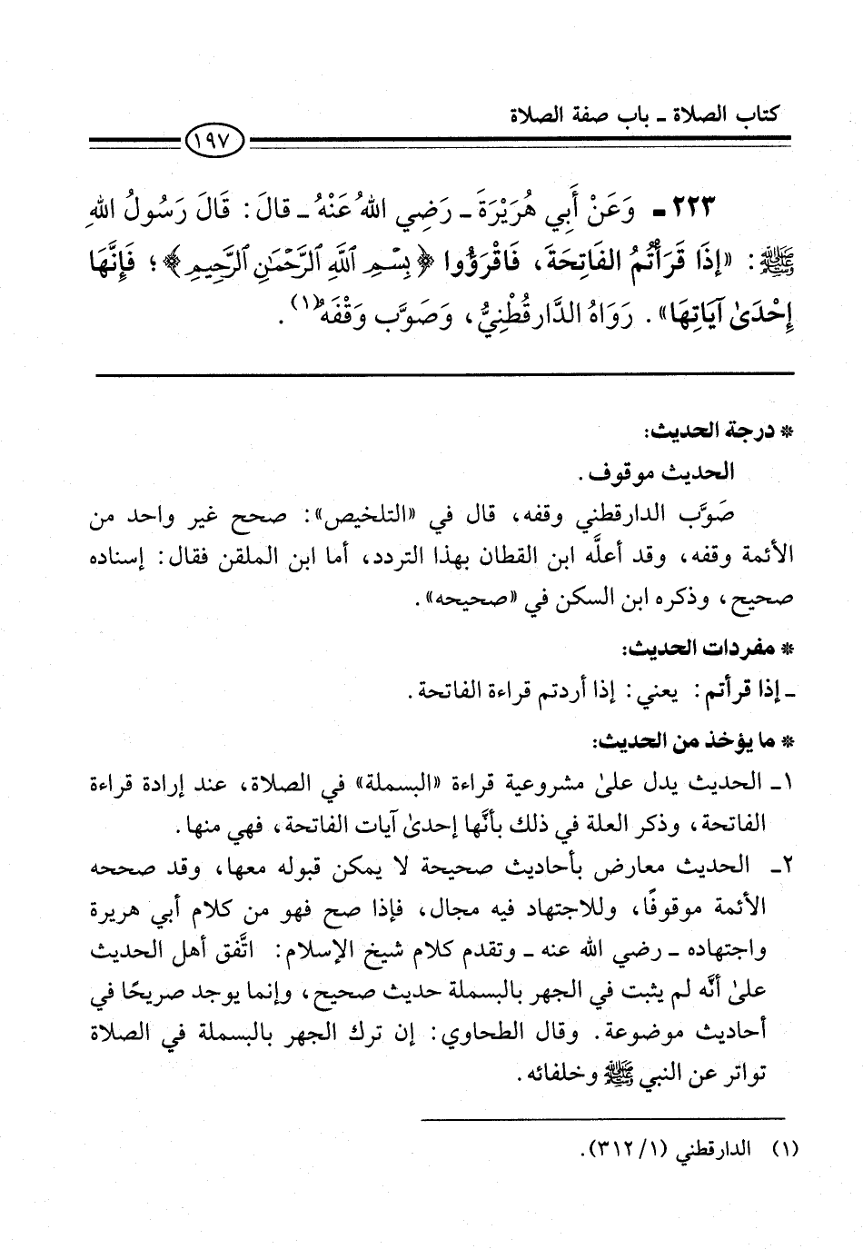 223 - وَعَنْ أَبِي هُرَيْرَةَ -رَضِي اللهُ عَنْهُ- قالَ: قَالَ رَسُولُ اللهِ -صلى الله عليه وسلم-: "إذا قَرَأتم الفَاتحَةَ، فَاقْرَؤوا {بِسْمِ اللَّهِ الرَّحْمَنِ الرَّحِيمِ}؛ فَإِنَّهَا إِحْدَى آيَاتِهَا". رَوَاهُ الدَّارقُطنِيُّ، وَصَوَّب وَقْفَهُ (¬1).