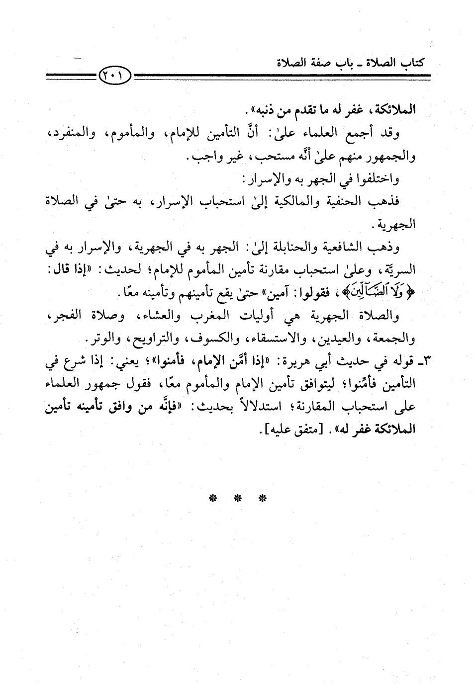 3 - قوله في حديث أبي هريرة: "إذا أمَّن الإِمام، فأمنوا"؛ يعني: إذا شرع في التأمين فأمِّنوا؛ ليتوافق تأمين الإِمام والمأموم معًا، فقول جمهور العلماء على استحباب المقارنة؛ استدلالاً بحديث: "فإنَّه من وافق تأمينه تأمين الملائكة غفر له". [متفق عليه].