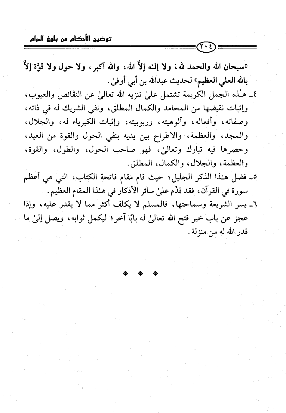 4 - هذه الجمل الكريمة تشتمل على تنزيه الله تعالى عن النقائص والعيوب، وإثبات نقيضها من المحامد والكمال المطلق، ونفي الشريك له في ذاته، وصفاته، وأفعاله، وألوهيته، وربوبيته، وإثبات الكبرياء له، والجلال، والمجد، والعظمة، والاطراح بين يديه بنفي الحول والقوة من العبد، وحصرها فيه تبارك وتعالى، فهو صاحب الحول، والطول، والقوة، والعظمة، والجلال، والكمال، المطلق.