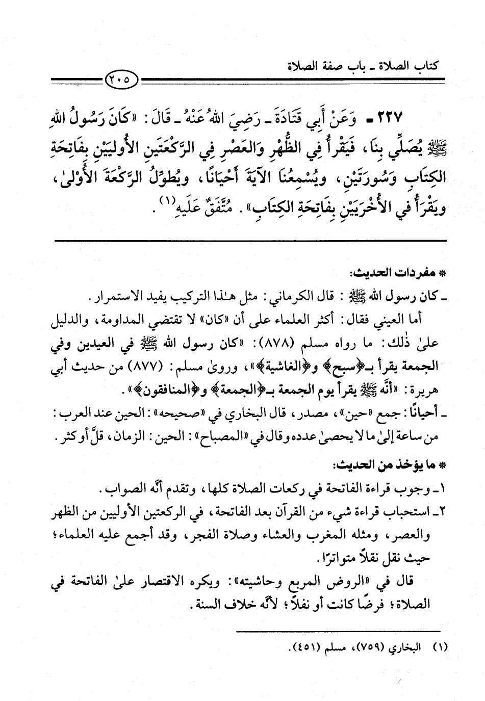 227 - وَعَنْ أَبِي قتادَةَ -رَضِيَ اللهُ عَنْهُ- قَالَ: "كَانَ رَسُولُ اللهِ -صلى الله عليه وسلم- يُصَلِّي بِنَا، فَيَقْرأُ فِي الظُّهْرِ وَالعَصْرِ فِي الرَّكْعَتَينِ الأُوليَيْنِ بفَاتِحَةِ الكِتَابِ وَسُورَتَيْنِ، ويُسْمِعُنَا الآيَةَ أَحْيَانًا، ويُطوِّلُ الرَّكْعَةَ الأُوْلى، ويَقْرَأُ فِي الأُخرَيَيْنِ بِفَاتِحَةِ الكِتَابِ". مُتَّفَقٌ عَلَيْهِ (¬1).