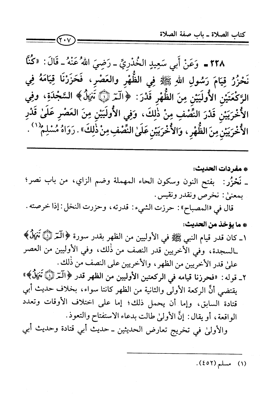 228 - وَعَنْ أَبي سَعِيدٍ الخُدْرِيِّ -رَضِيَ اللهُ عَنْهُ- قَالَ: "كُنَّا نَحْزُرُ قِيَامَ رَسُولِ اللهِ -صلى الله عليه وسلم- فِي الظُّهْرِ والعَصْرِ، فَحَزَرْنَا قِيَامَهُ فِي الرَّكْعَتَيْنِ الأُولَيَيْنِ مِنَ الظُّهْرِ قَدْرَ: {الم (1) تَنْزِيلُ} السَّجْدَةِ، وفِي الأُخرَيَيْنِ قَدْرَ النِّصْفِ مِنْ ذلِكَ، وَفِي الأولَيَيْنِ مِنَ العَصْرِ عَلَى قَدْرِ الأُخْرَيَيْنِ مِنَ الظُّهْرِ، وَالأُخْرَيَيْنِ عَلَى النِّصْفِ مِنْ ذلِكَ". رَوَاهُ مُسْلِمٌ (¬1).